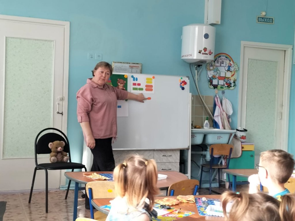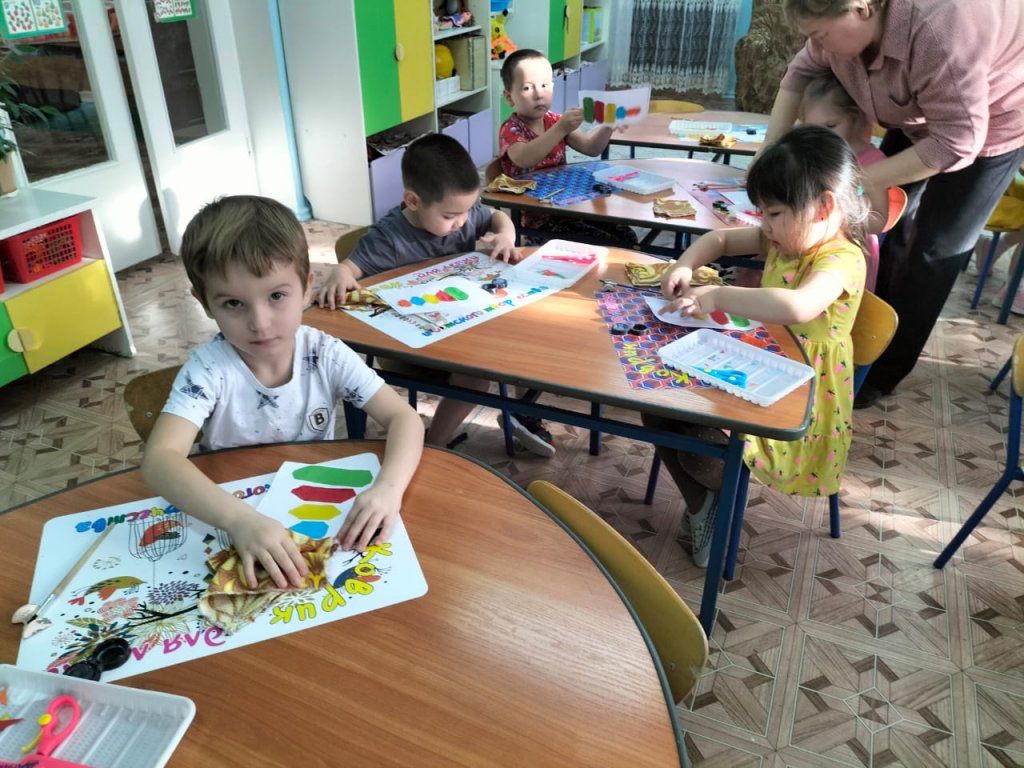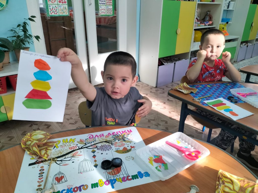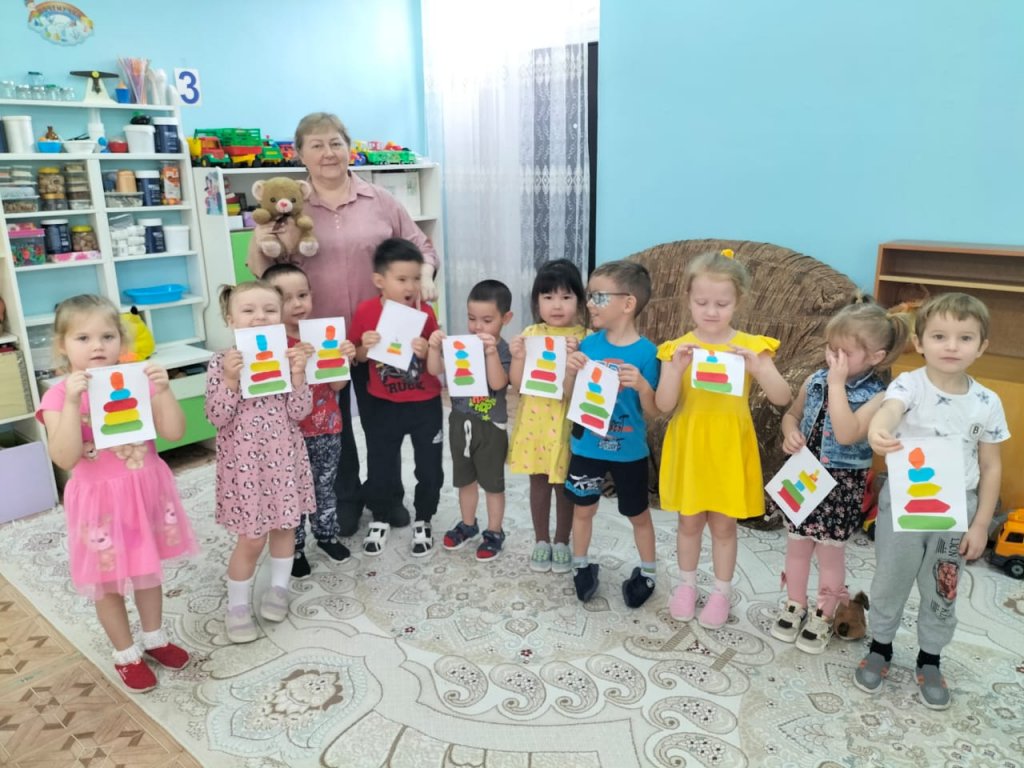 "Сказка» тобында «Аюға арналған пирамида» аппликациясы бойынша ДБ өтті. Балалар аю балаға пирамида жасады. Алдымен олар бұрыштарды кесу арқылы тікбұрышты пішінді бөлшектерді сопақша пішінді бөлшектерге айналдырып, оларды қағаз бетіне төменнен жоғарыға қарай ең үлкендерінен ең кішісіне дейін жайып тастады; содан кейін оларды негізге желімдеді. Жұмыс аяқталғаннан кейін өз пирамидаларын аю баласына сыйға тартты.