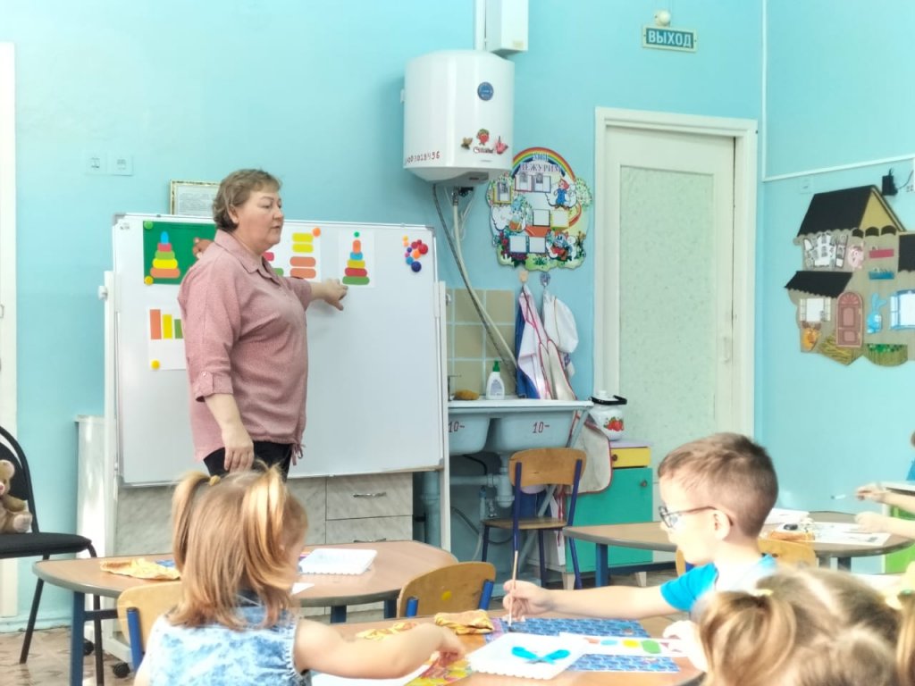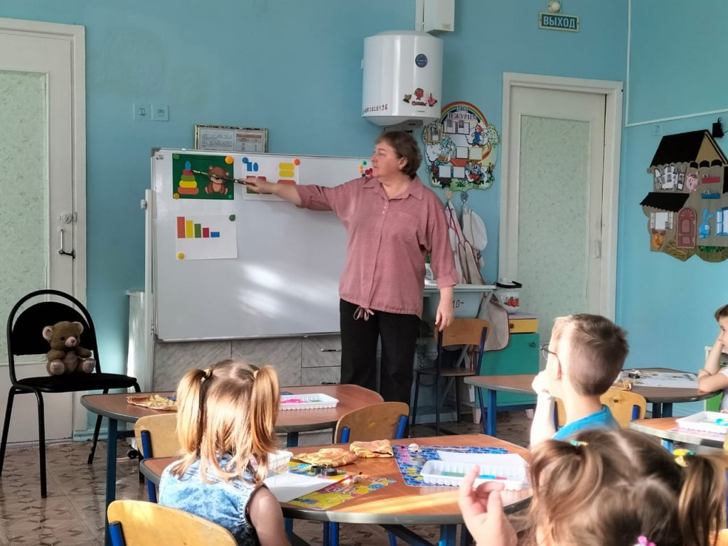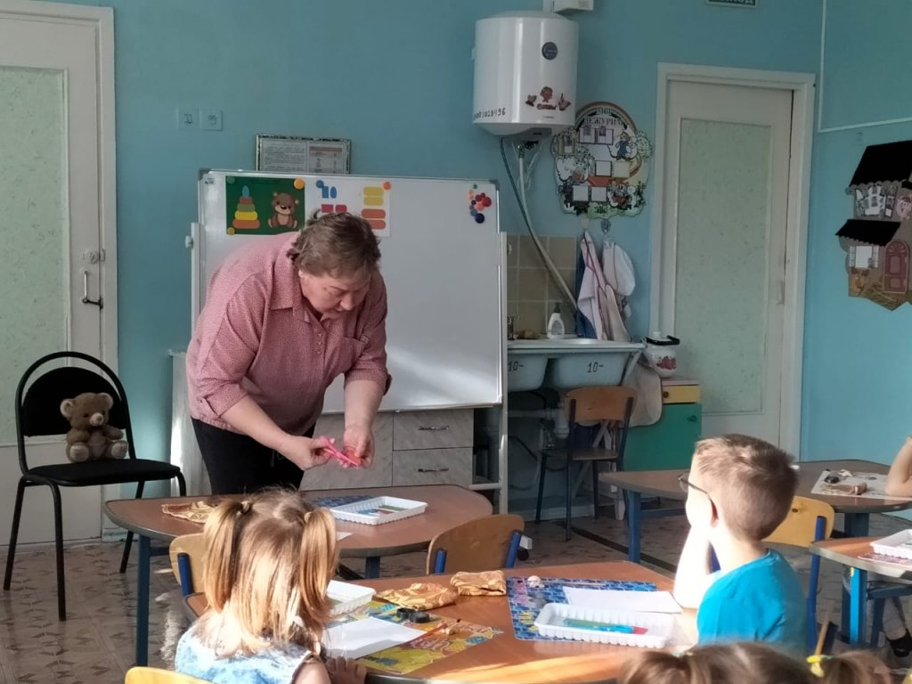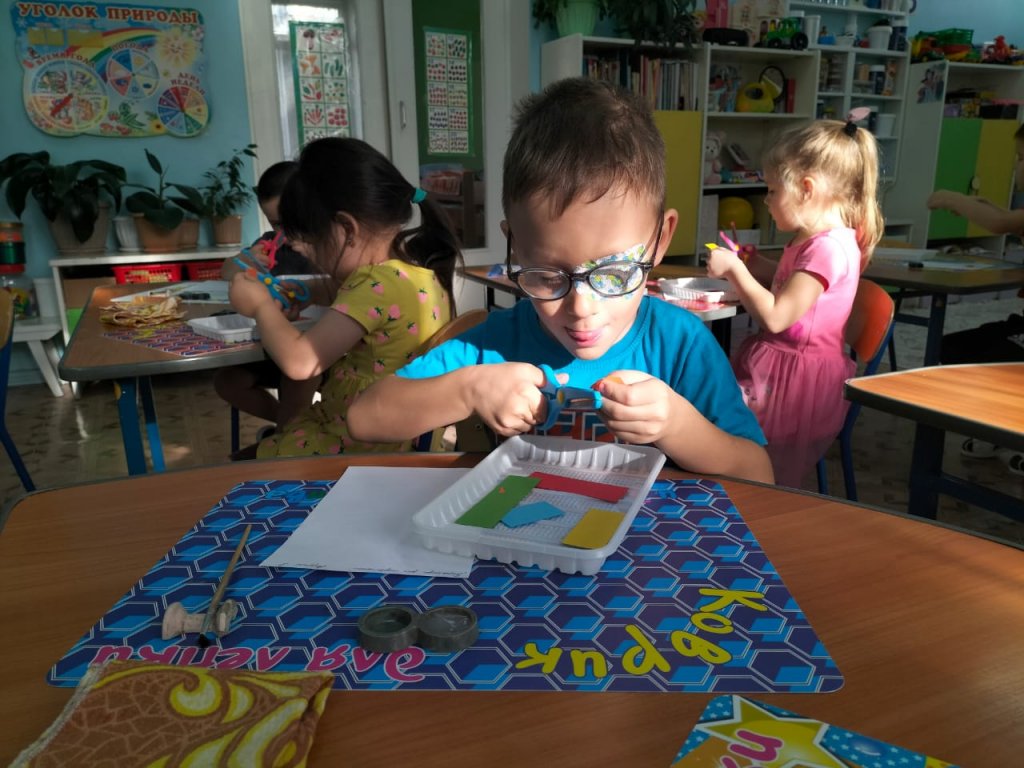 "Сказка» тобында «Аюға арналған пирамида» аппликациясы бойынша ДБ өтті. Балалар аю балаға пирамида жасады. Алдымен олар бұрыштарды кесу арқылы тікбұрышты пішінді бөлшектерді сопақша пішінді бөлшектерге айналдырып, оларды қағаз бетіне төменнен жоғарыға қарай ең үлкендерінен ең кішісіне дейін жайып тастады; содан кейін оларды негізге желімдеді. Жұмыс аяқталғаннан кейін өз пирамидаларын аю баласына сыйға тартты.