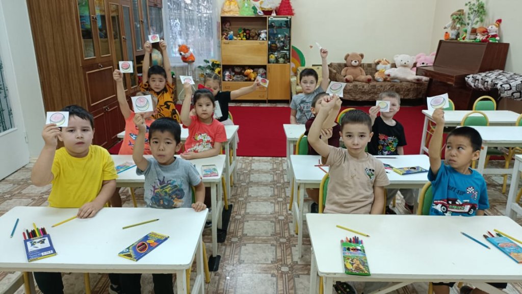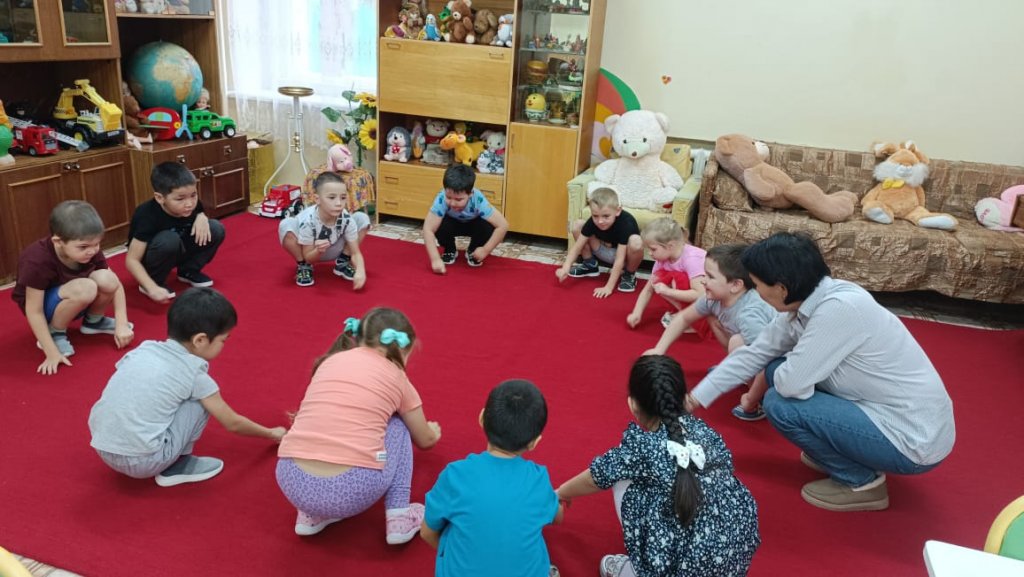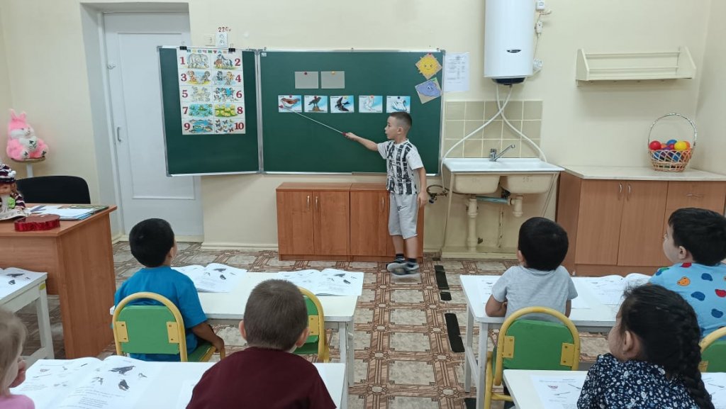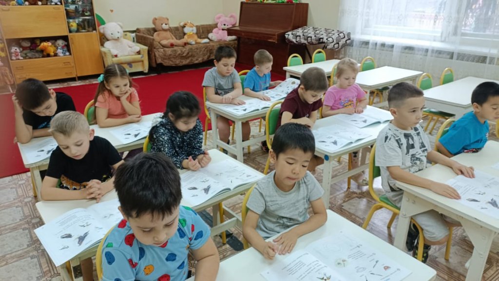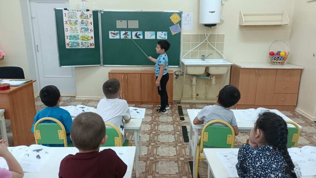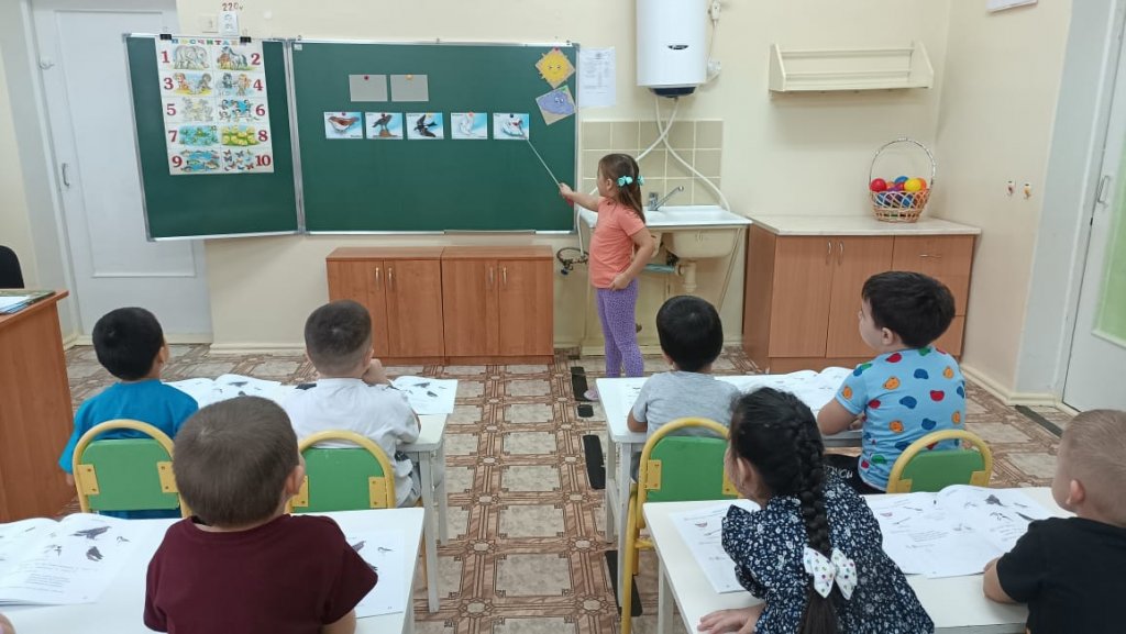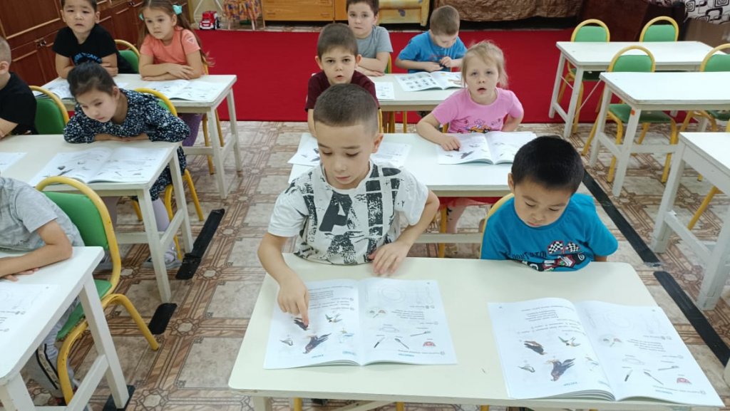 Сабақта мектеп алдындағы топтағы балалар «Құстар» «Құстар» тақырыбындағы жаңа сөздермен танысты. (торғай, аққу, қарға, қарлығаш, көгершін). Кім деген сұраққа жауап беруді үйрендік. (мынау кім?) Мынау- торғай. «Ұшты-ұшты» қазақ ұлттық ойынын ойнады. Құстар туралы білімдерін бекітті. Сабақ барысында түстер (қызыл, сары, көк, ақ) туралы білімдерін бекітті. Сары доп. Допты мұғалім қазақ тілінде атаған түске бояды. Сабақтың мақсаты - тірі табиғат туралы түсініктерді кеңейту және нақтылау. Байқауға, қызығушылықты дамытуға, туған өлкенің табиғатына сүйіспеншілік пен ұқыпты қарым-қатынасты тәрбиелеуге үйрету.