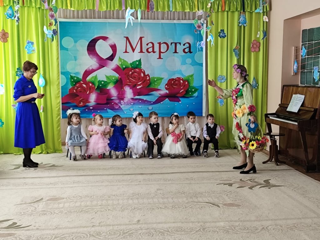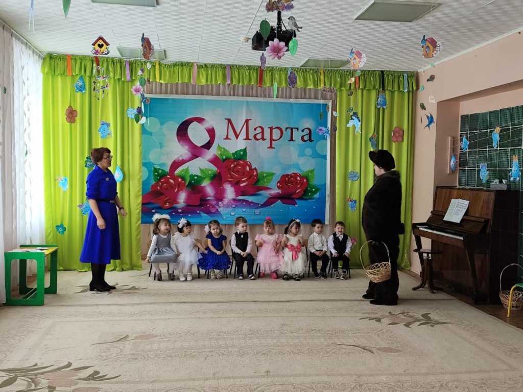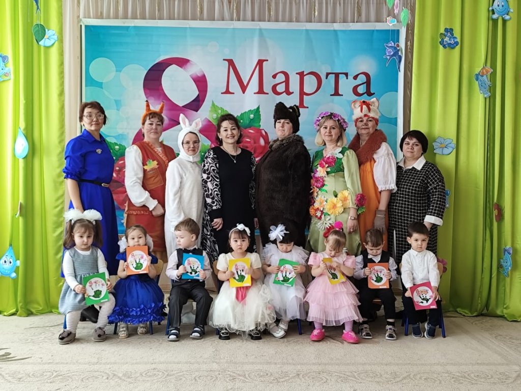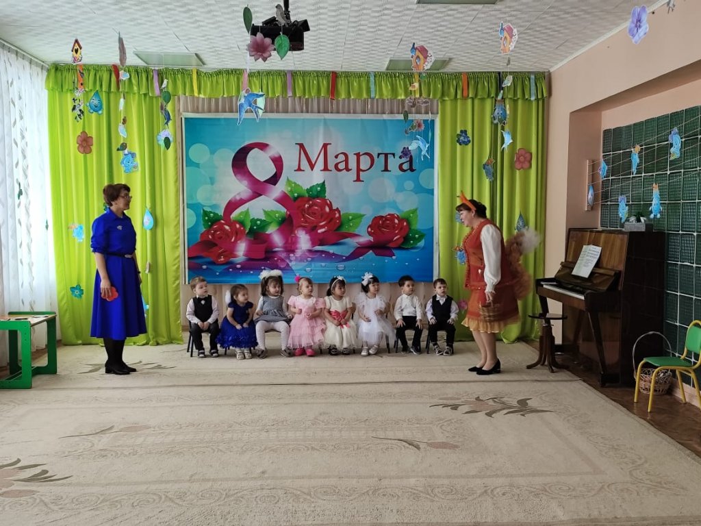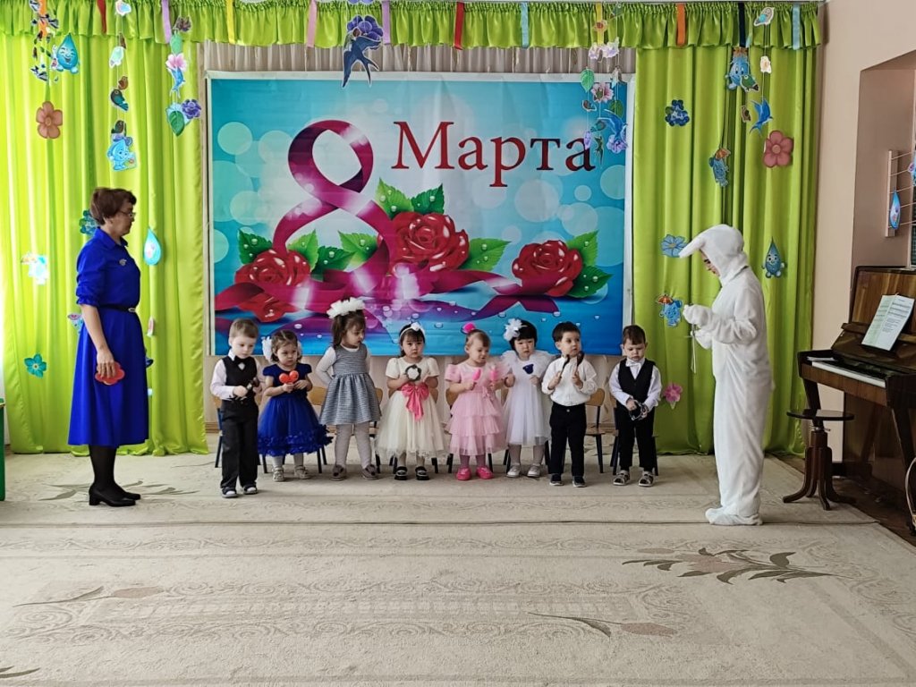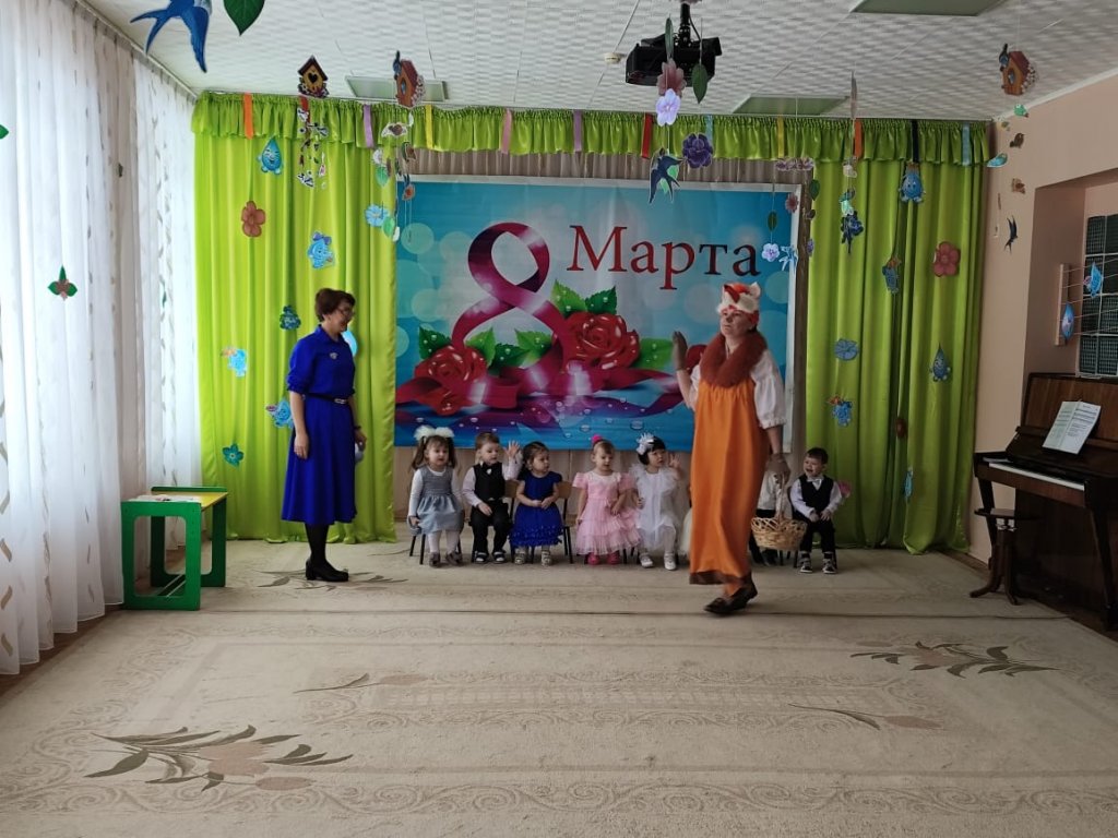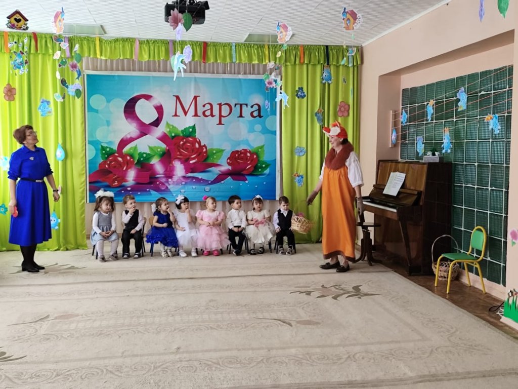 Балаларға ертегі кейіпкерлері келді: Зайчик, Белочка, Лисичка, Мишка, Весна. Балалар ән айтып, өлең оқып, би билеп, аналары мен әжелерін құттықтады. Мереке соңында Көктем балаларға тәтті-дәмділер сыйлады.