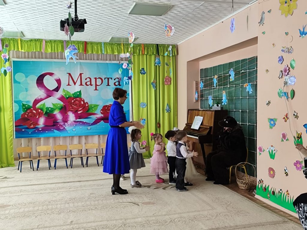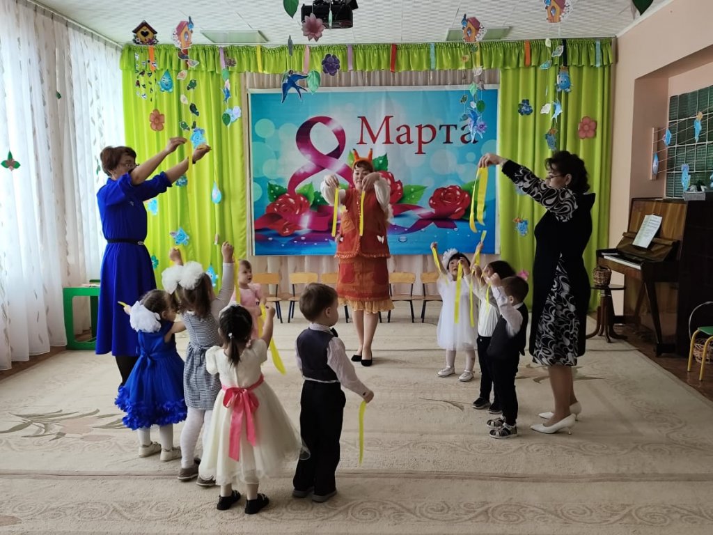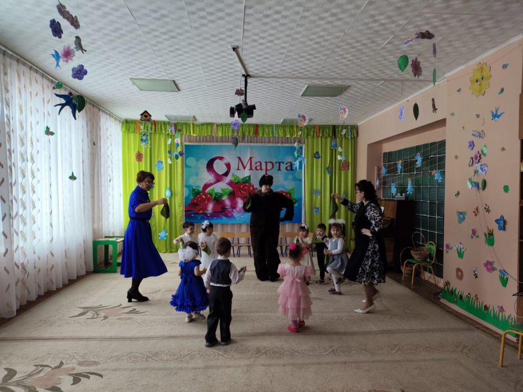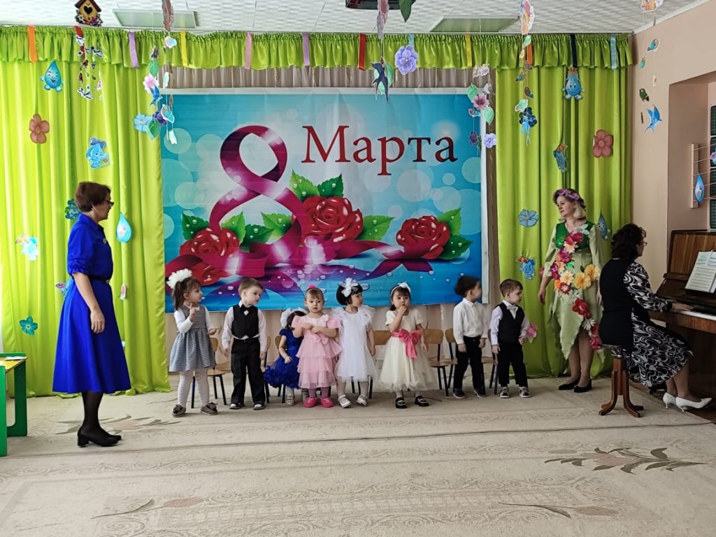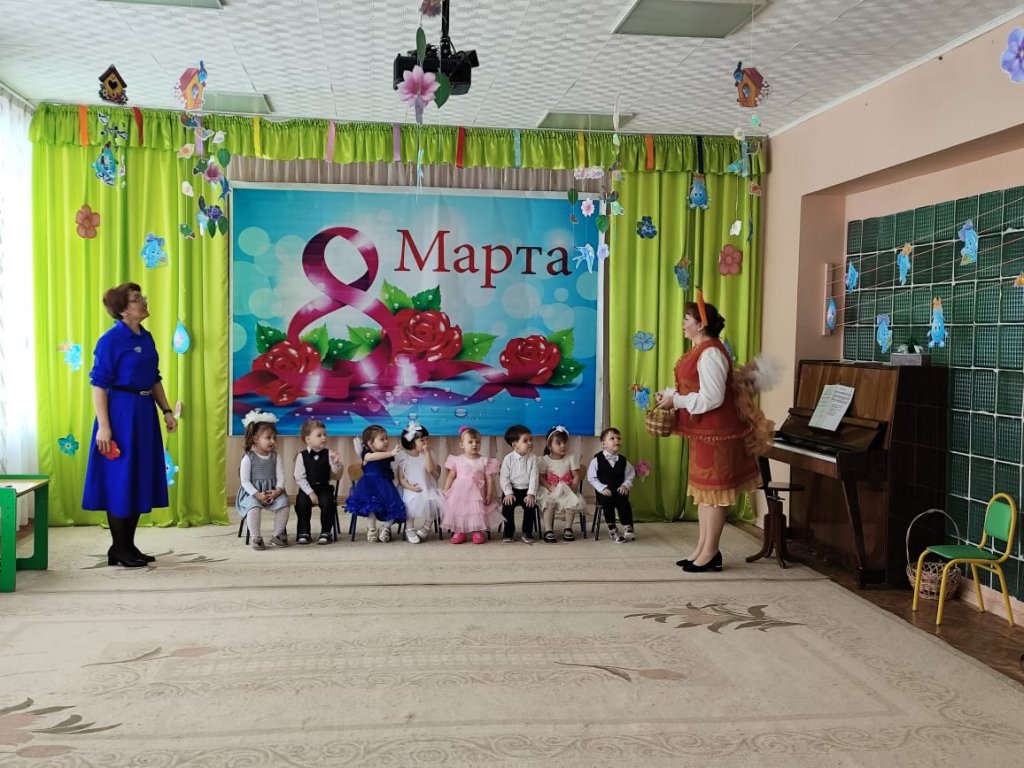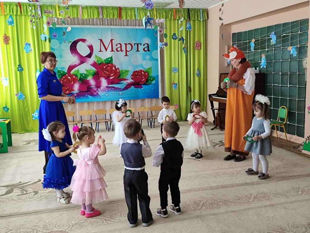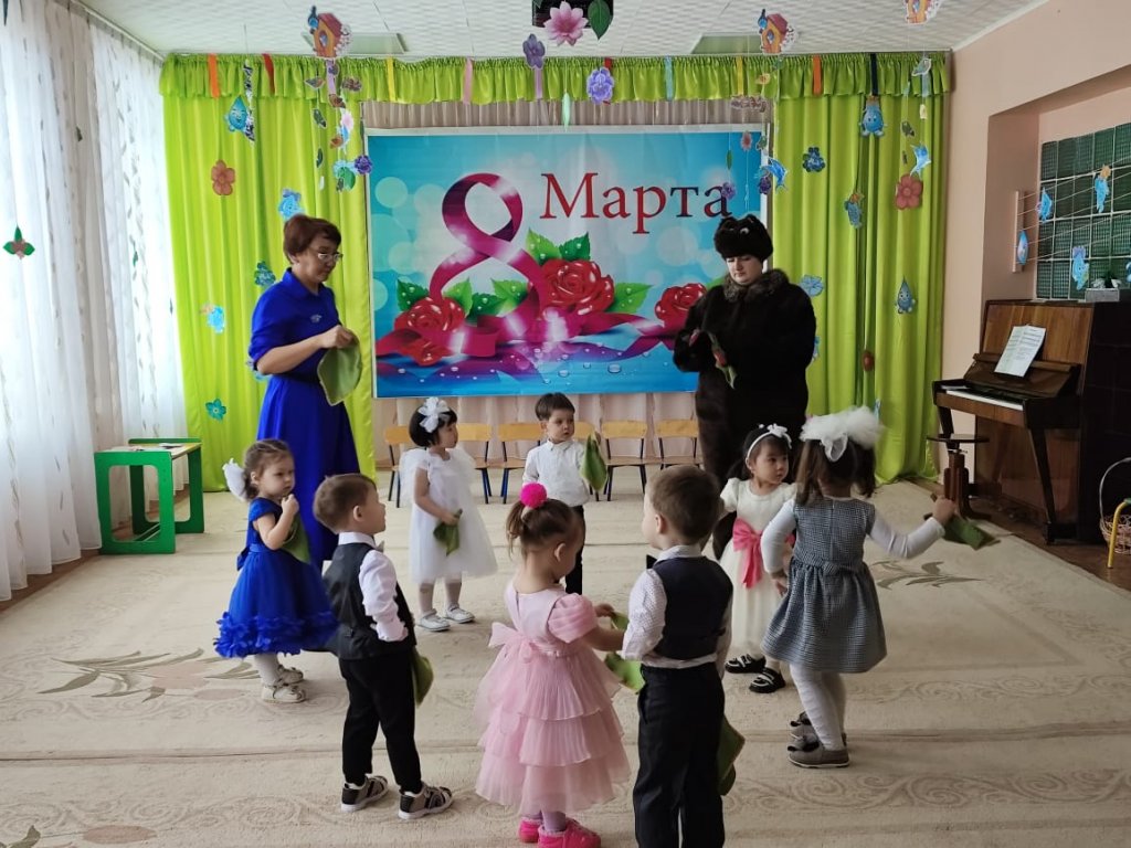Балаларға ертегі кейіпкерлері келді: Зайчик, Белочка, Лисичка, Мишка, Весна. Балалар ән айтып, өлең оқып, би билеп, аналары мен әжелерін құттықтады. Мереке соңында Көктем балаларға тәтті-дәмділер сыйлады.